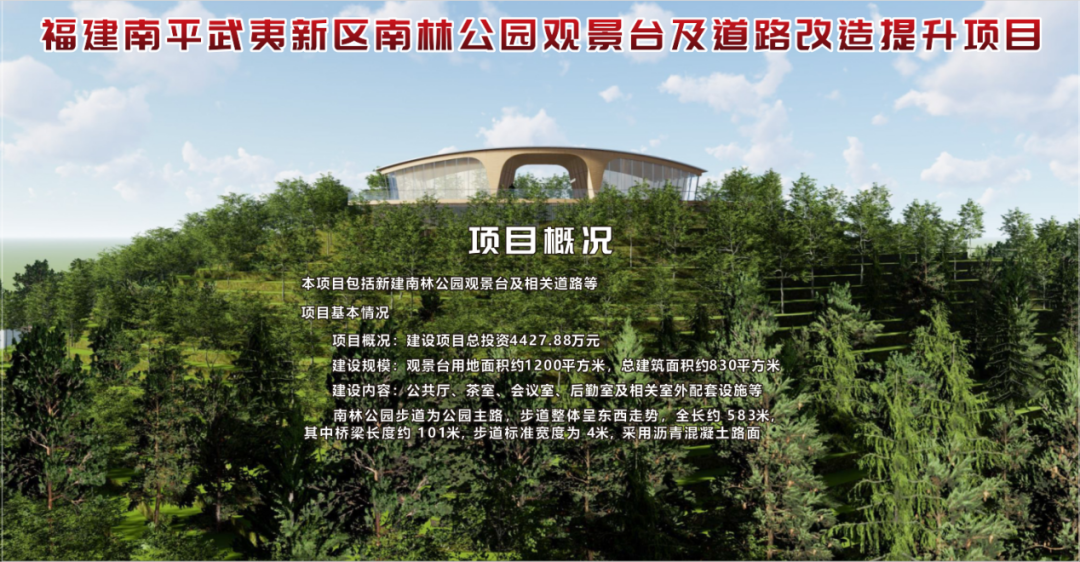1月13日上午,福建南平武夷新區(qū)南林公園觀景臺(tái)及道路改造提升項(xiàng)目在南林公園舉辦開工儀式,該項(xiàng)目的代業(yè)主單位為福建省閩北水利水電工程公司。參加本次開工儀式的有:南平市武夷新區(qū)管理委員會(huì)、南平市城市公園服務(wù)中心、南平綠發(fā)集團(tuán)有限公司、南平武夷新區(qū)城市發(fā)展集團(tuán)有限公司、福建省閩北水利水電工程公司等主要單位及領(lǐng)導(dǎo)。 南林公園觀景臺(tái)及道路改造提升項(xiàng)目本項(xiàng)目包括新建南林公園觀景臺(tái)及相關(guān)道路等。建設(shè)項(xiàng)目總投資4427.88萬元。建設(shè)規(guī)模為觀景臺(tái)用地面積約1200平方米,總建筑面積約830平方米,建設(shè)內(nèi)容包含公共廳、茶室、會(huì)議室、后勤室及相關(guān)室外配套設(shè)施等;南林公園步道為公園主路,步道整體呈東西走勢(shì),全長(zhǎng)約 583m,其中橋梁長(zhǎng)度約 101m,步道標(biāo)準(zhǔn)寬度為 4m,采用瀝青混凝土路面。